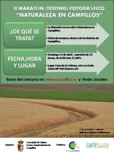 La Concejalía de Cultura del Ayuntamiento de Campillos organiza el II Maratón Fotográfico “Naturaleza en Campillos”, que tendrá lugar el próximo 15 de abril de 8:00 a 21:00 horas. La participación en este concurso está abierta a todas las personas, aficionadas o profesionales de la fotografía, que sean autoras de las imágenes presentadas y posean los derechos de las mismas, sin ninguna restricción de agencias o empresas. La temática será la naturaleza en Campillos, en cualquiera de sus aspectos, y las inscripciones se realizarán el mismo día del maratón.